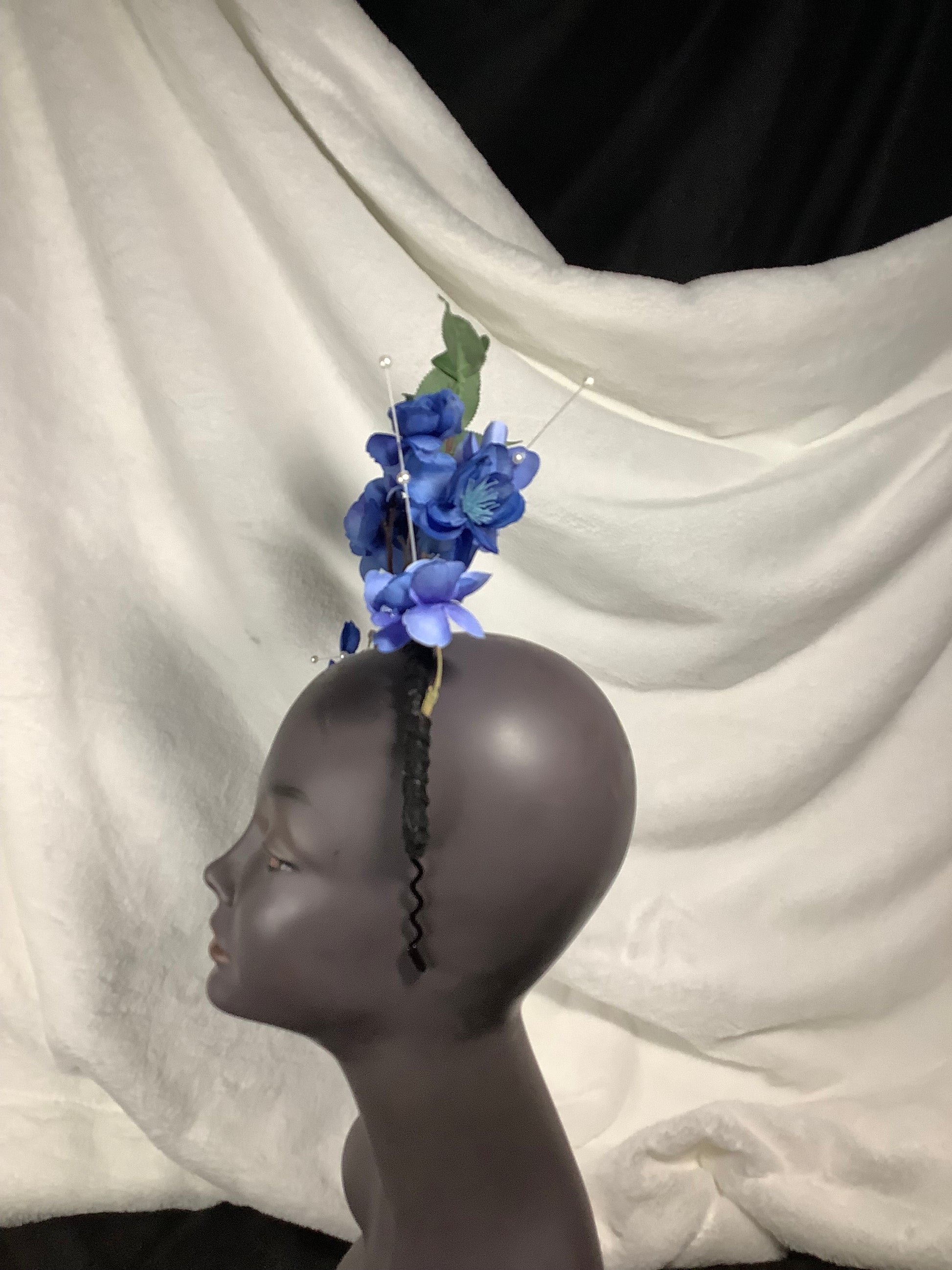 Let your style flourish with Garden Muse 2025, a blooming crown of artistry inspired by fairytale gardens and avant-garde fashion. Sprouting from a wrapped black headband, sprigs of deep indigo and violet blossoms stretch like vines in full bloom, accented with dainty pearl-tipped stems and lifelike green leaves.