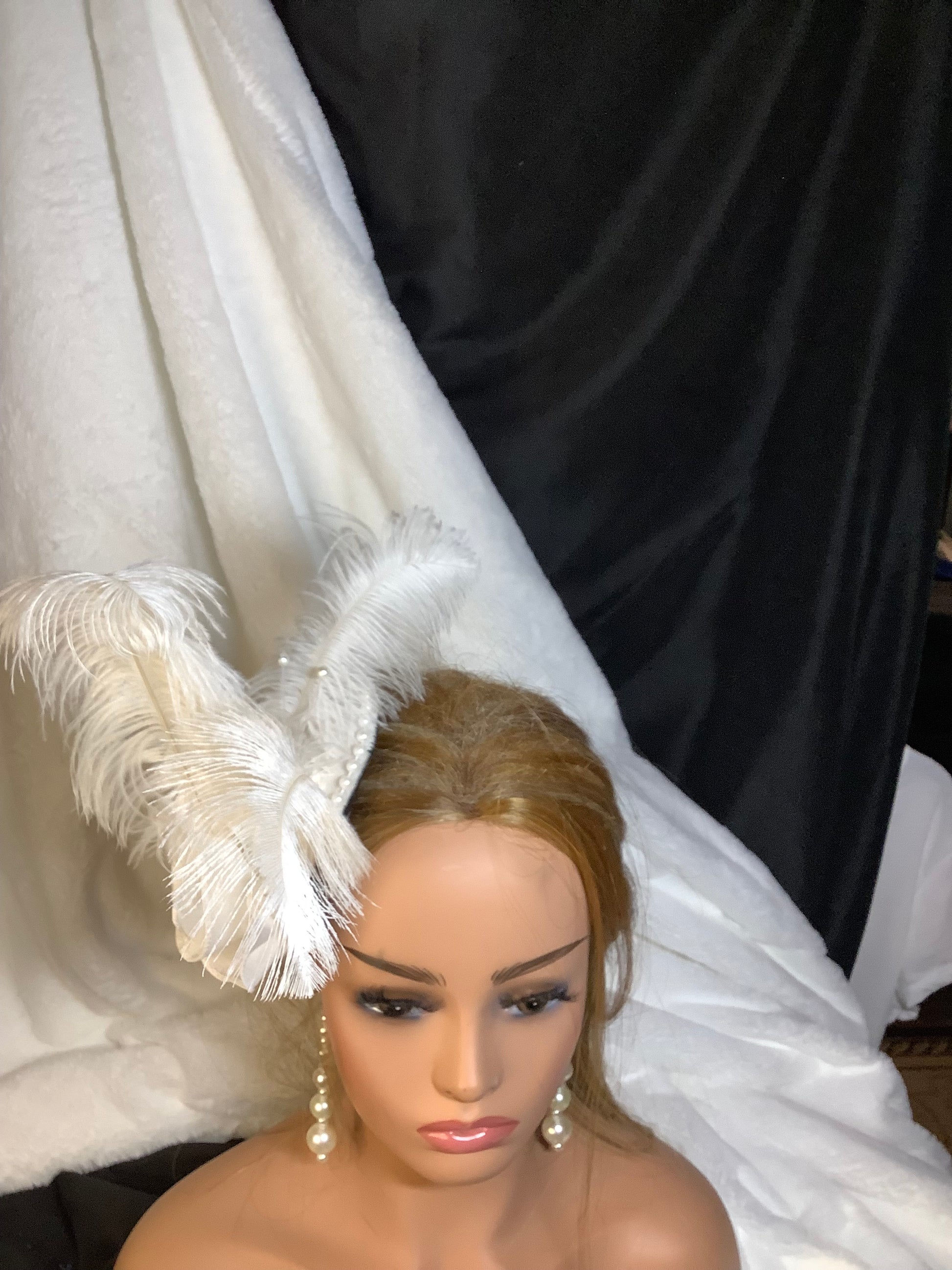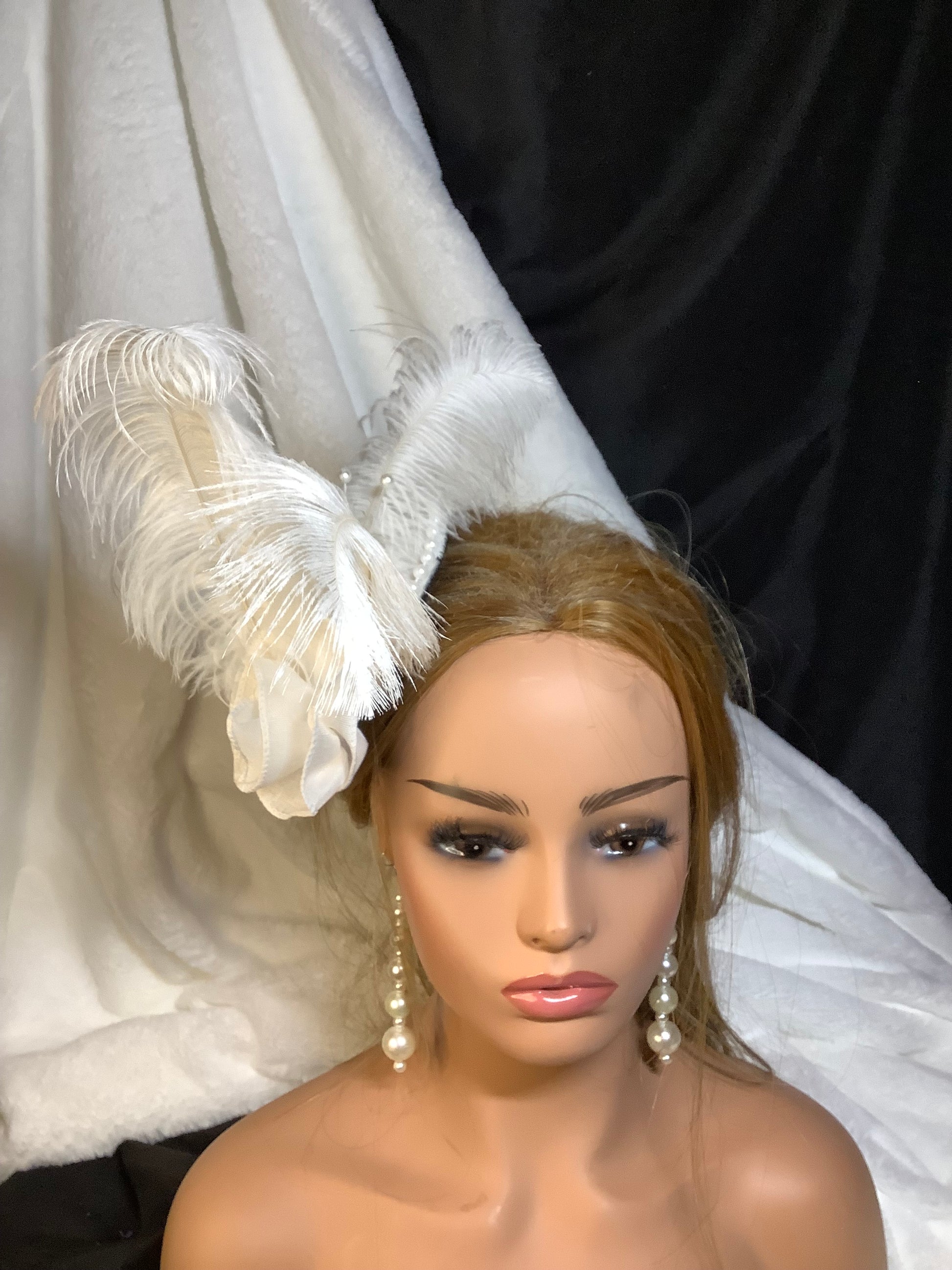 Elevate your elegance with Feathered Whisper 2025, a lavish ode to classic sophistication. This white fascinator dazzles with dramatic ostrich-style feathers that dance with every turn of your head, anchored by a delicate rosette and framed with a trim of pearlescent beading for timeless appeal.