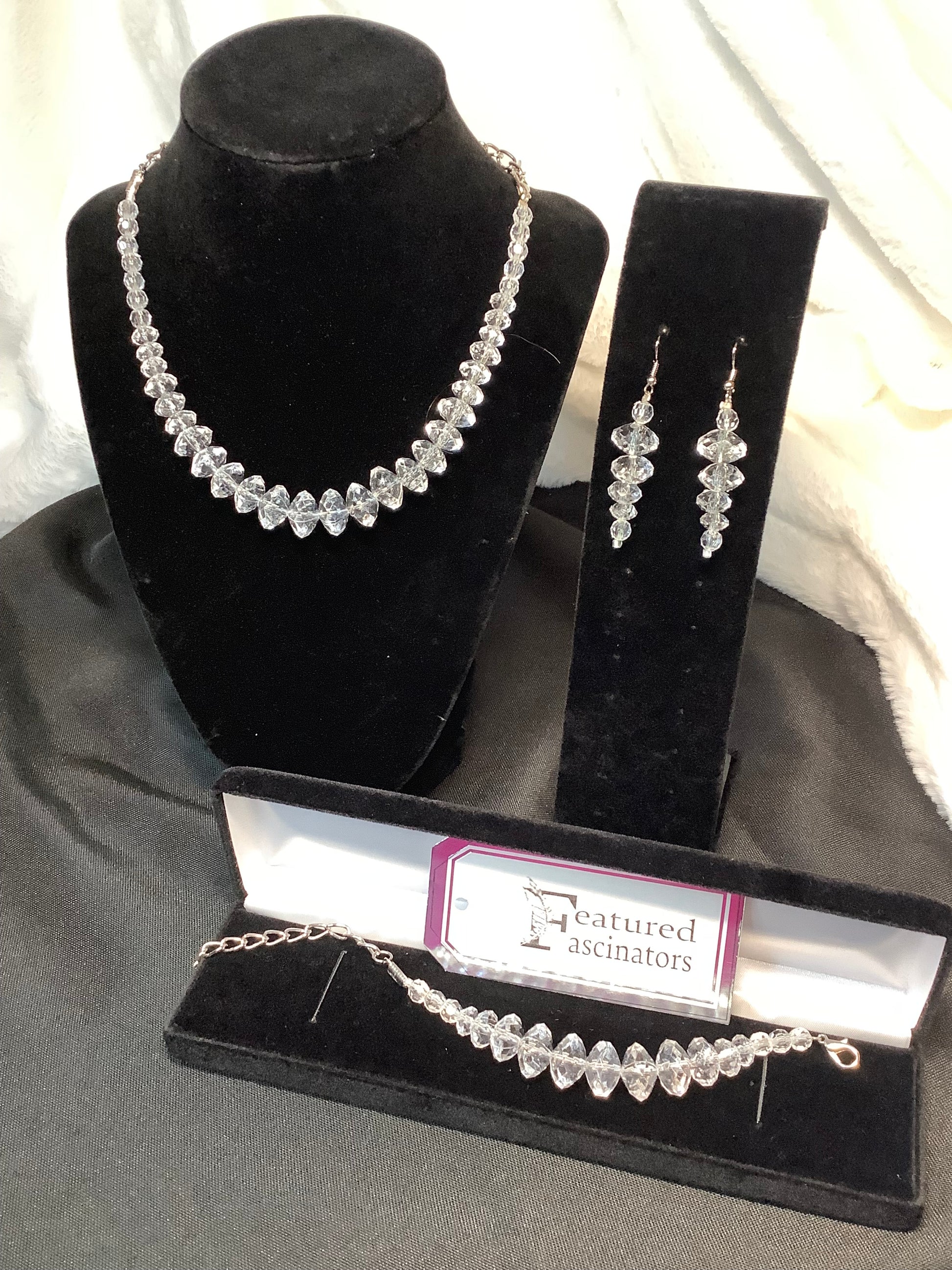 Step into timeless sophistication with the Crystal Elegance Full Set, a dazzling ensemble that pairs classic beauty with modern flair. This collection features a handcrafted fascinator in ivory-white with sculpted fabric and silver sprays, offering a show-stopping crown to the perfectly coordinated necklace, bracelet, and earrings. Each jewelry piece sparkles with tiered clear crystal beads that reflect light from every angle — ideal for weddings, garden parties, and Sunday best.