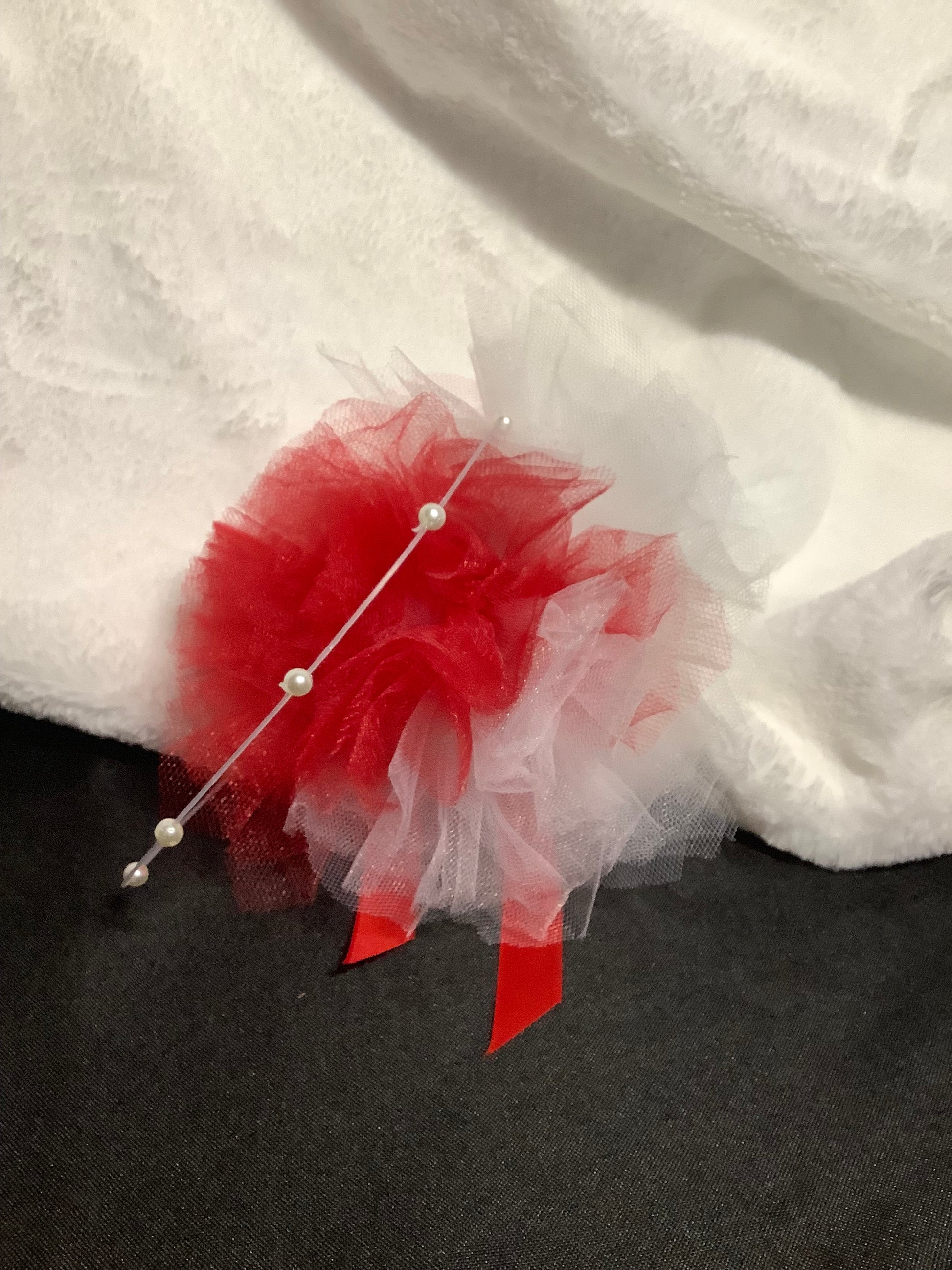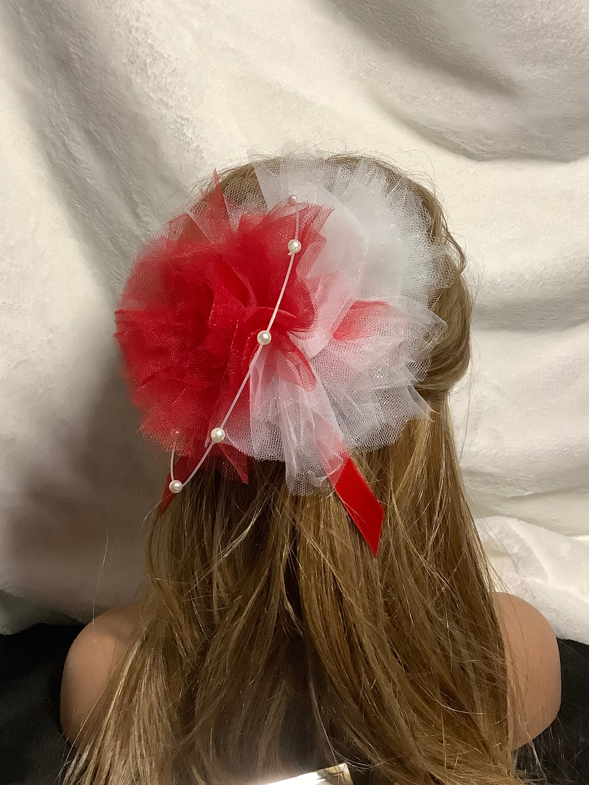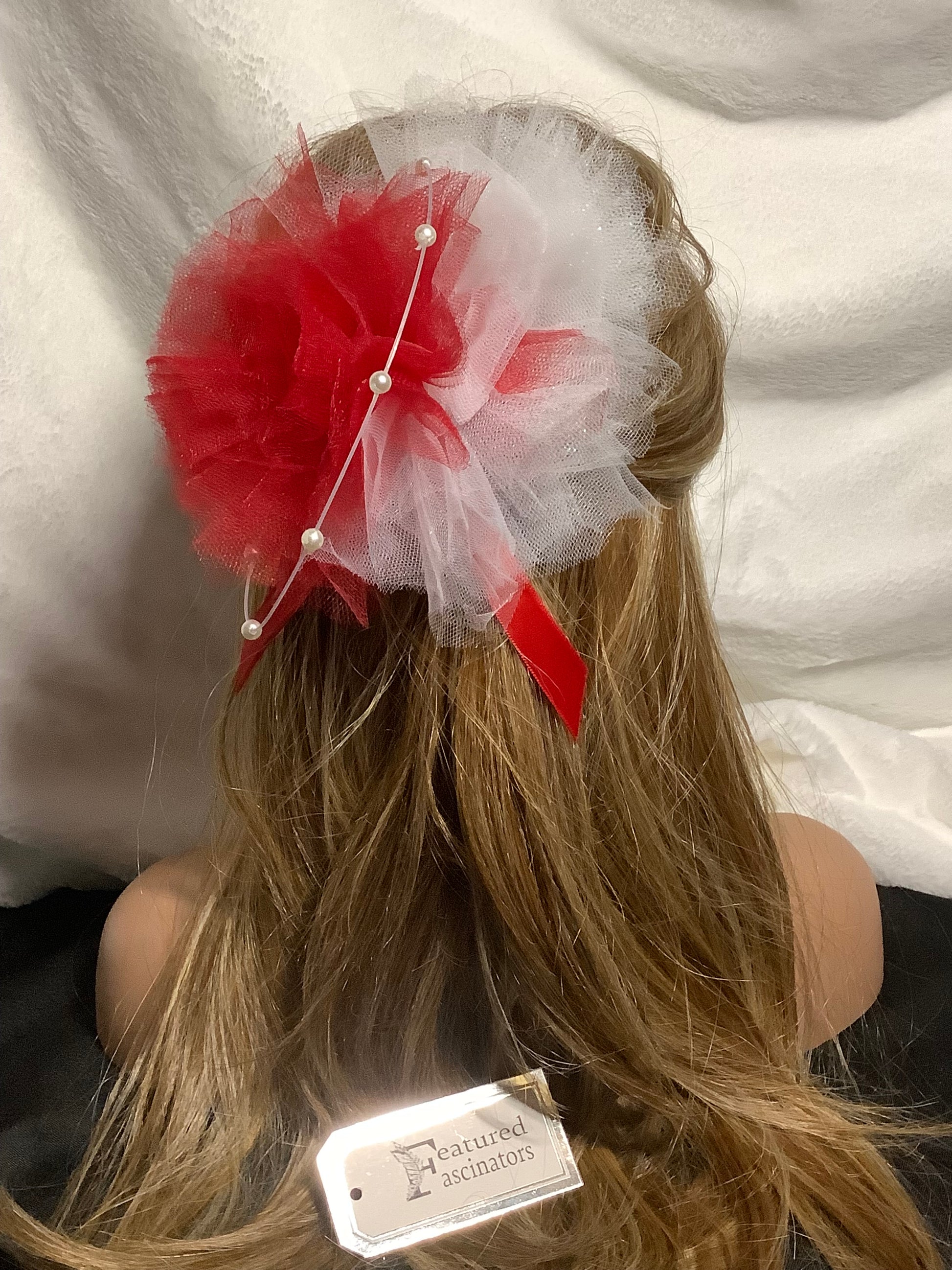 At the heart of this fascinator is a voluminous bloom made from layers of soft red and white tulle, artfully arranged to mimic a blossoming flower. The airy texture gives it an ethereal presence, making it feel weightless and easy to wear all day.