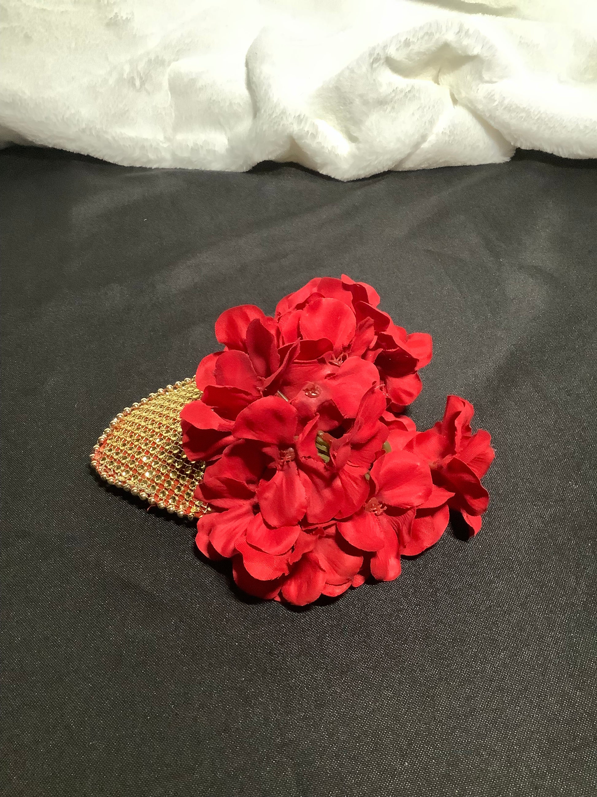Color Palette: Sparkling gold rhinestone heart base with vibrant red floral accents
