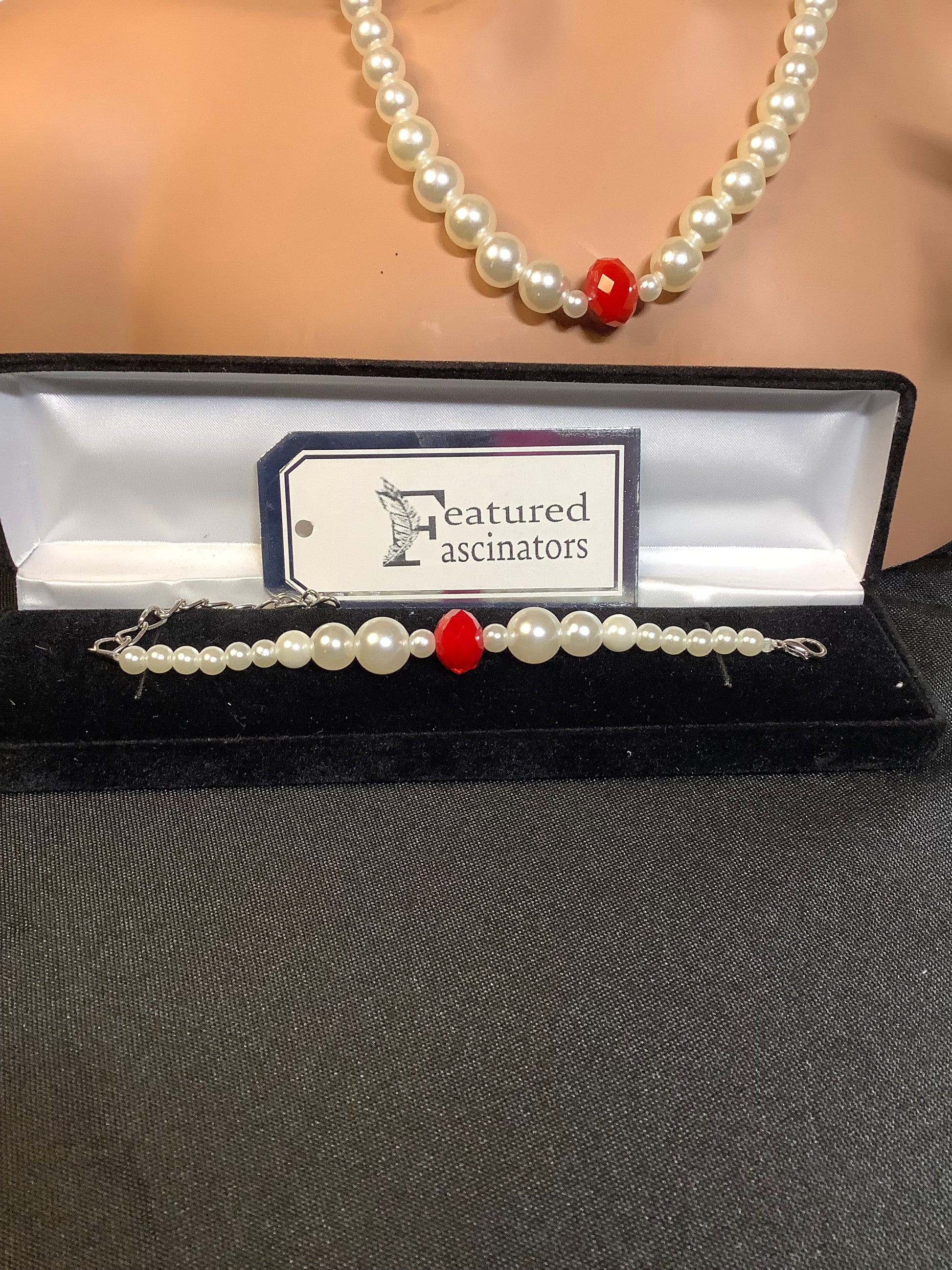 Add brilliance to your wrist with this handmade bracelet featuring a radiant red crystal cluster surrounded by soft white pearls. The adjustable clasp ensures a secure and elegant fit.