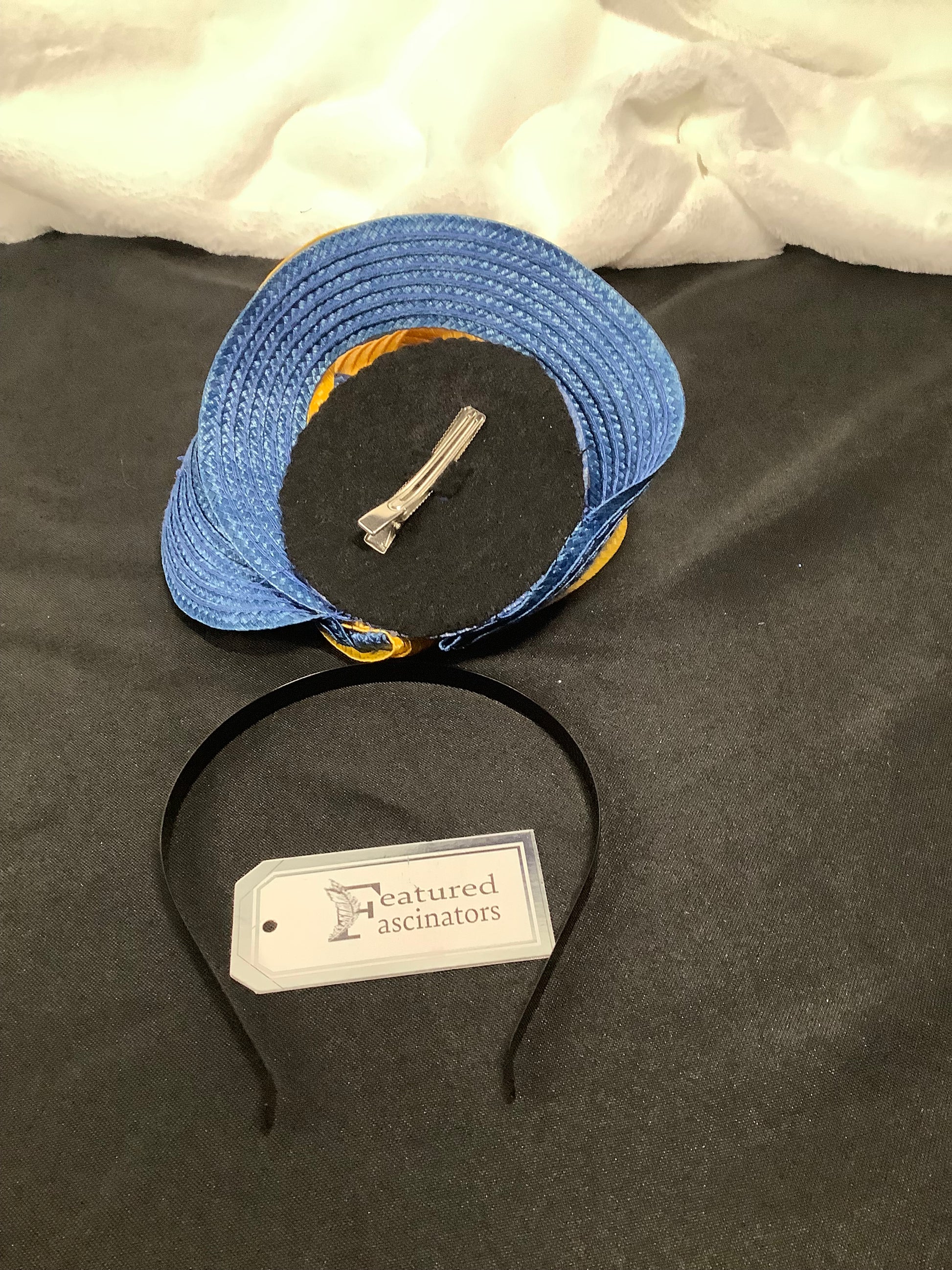 Bright, bold, and brilliantly sculpted, Golden Bloom 2025 is a fascinator that radiates sunshine and royalty. Its looping golden sinamay forms a modern teardrop silhouette, gracefully perched atop a cobalt blue base adorned with a rich spray of sapphire-toned blossoms.