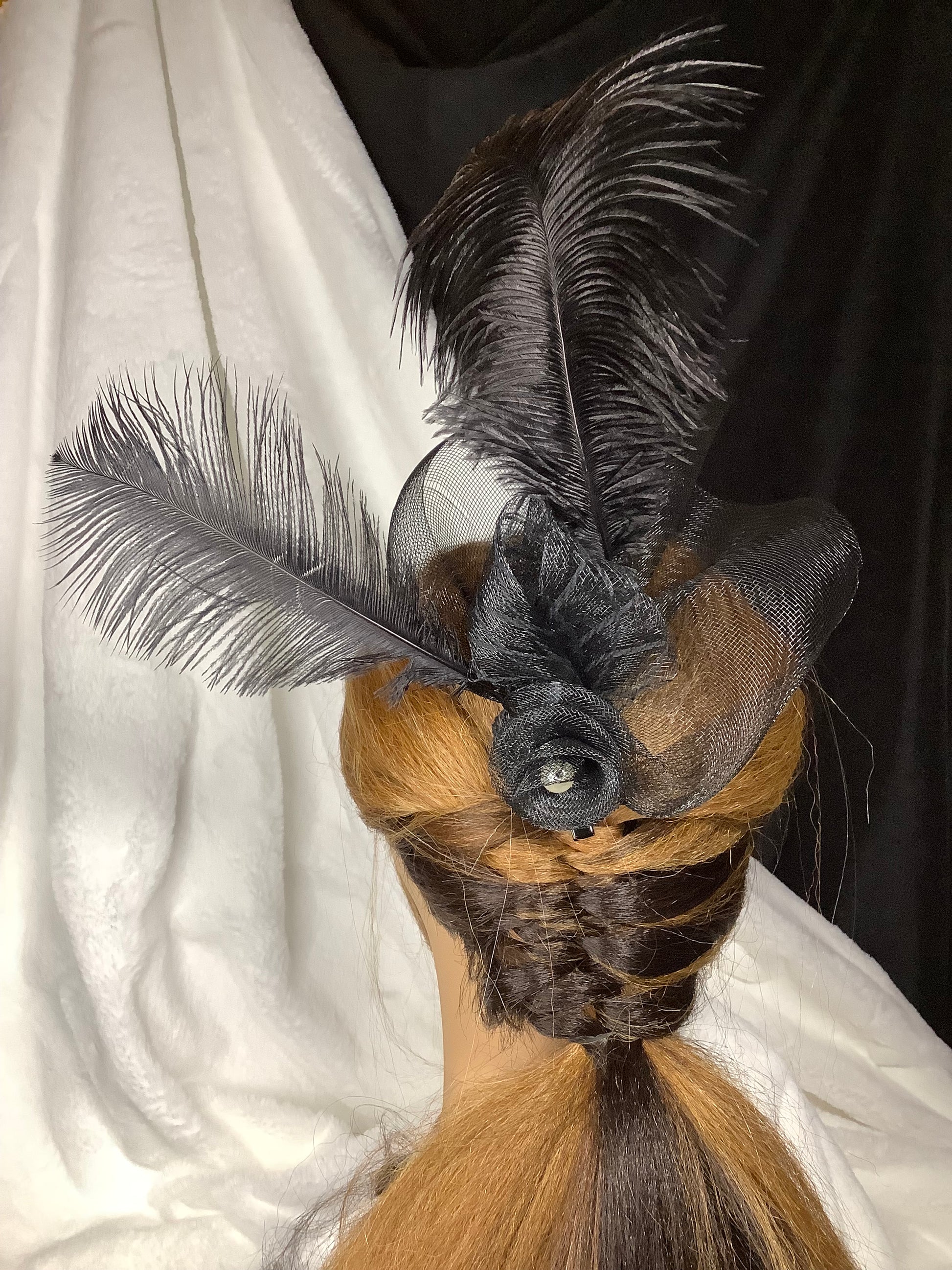 "That's No Raven" is a playful reference to its dramatic feather display, evoking the grandeur of classic millinery without directly invoking a raven. It hints at Gothic beauty with a wink, making it a conversation starter at any event.