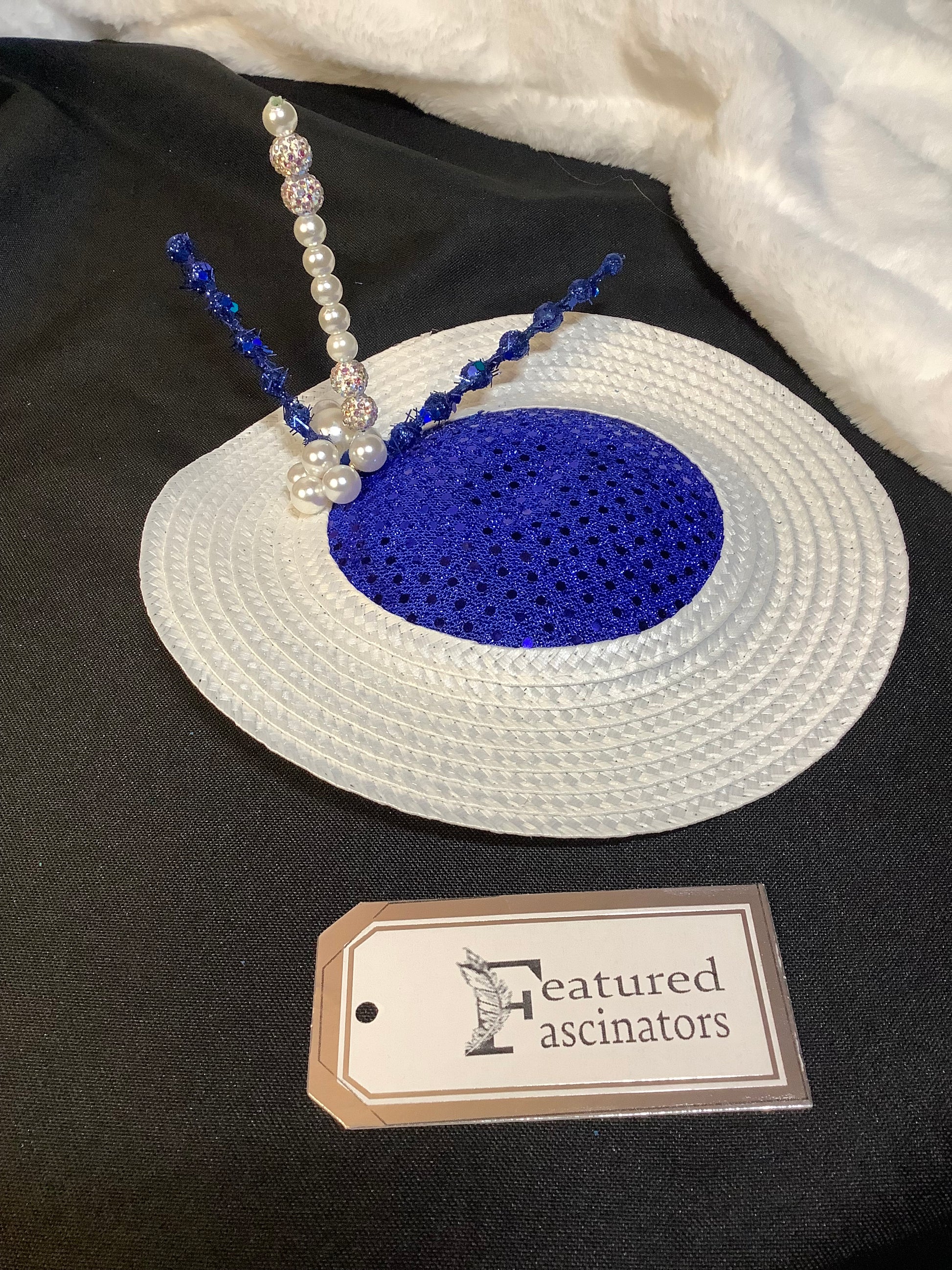 Make a bold statement in timeless white and dazzling blue with our “Modern Orbit” fascinator – a breathtaking fusion of modern minimalism and celestial glamour. This striking piece features a smooth, circular white sinamay disc that provides a crisp, clean base, while the center is encrusted with sparkling royal blue sequins, giving the illusion of a starlit sky or shimmering gem.